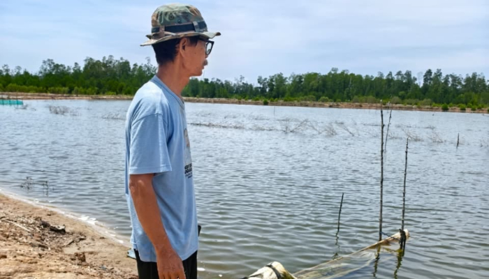 Yusuf sedang menyaksikan ikan di tambak miliknya terapung mati diduga kuat karena dampak aktivitas PT WIN, 27 Desember 2025. Foto: Hermina/Jagakampung.net