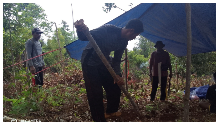 Anwar dan warga lainnya tengah membangun pos jaga agar perusahaan tidak melakukan Penyerobotan lahan warga, 20 Februari 2023. Foto: Wilman/Jagakampung.net
