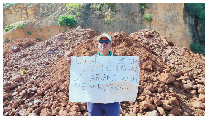 Gerhana berdiri di lahan miliknya sambil membentangkan poster bertuliskan kalimat protes kepada PT Integra yang menambang tanpa seizinnya, 6 Desember 2025. Foto: Hermina/Jagakampung.net