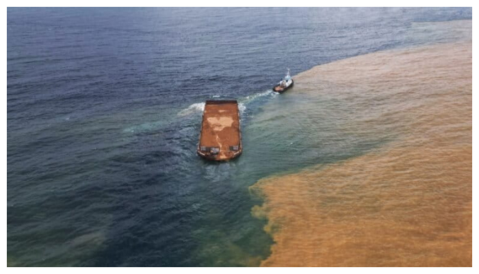 Laut Wawonii dengan sebagian air berubah warga oranye, diduga cemaran ore nikel. Foto: Riza Salman/ Mongabay Indonesia